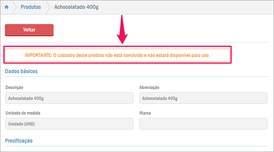 Assim o produto tem seu cadastro inicial concluído, porém ainda não está pronto para uso, pois existem certos detalhes ainda que precisam ser acertados.