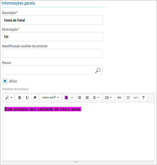 O cadastro da cesta iniciará da mesma forma que qualquer outro, acessando: Menu > Cadastros > Produto > Produtos e depois pressionando o botão Novo. Então, informe a Descrição, que no nosso caso será “Cesta de Natal”, e deixe o campo Abreviação como julgar melhor. No nosso exemplo, vamos usar a sigla “CN”. A opção Ativo deve permanecer marcada para que seja possível vender este produto posteriormente. Além disso, você pode acrescentar algo nos campos Identificação auxiliar do produto, Marca e Detalhes do produto, se desejar.