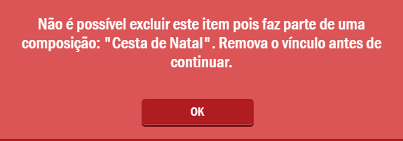 Além disso, vale ressaltar que não é possível adicionar um produto de composição como item filho. Por exemplo, se você fizer um novo produto de composição de estoque, e tentar colocar a Cesta de Natal como um dos itens filhos, o sistema barrará a operação.