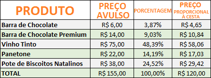 No caso da Cesta de Natal, por exemplo, todos os itens separadamente somam R$ 155,00. Porém, a cesta é vendida por apenas R$ 120,00. Portanto, os chocolates, o vinho, o panetone e o biscoito terão o preço reduzido proporcionalmente. Veja os números exatos na tabela abaixo: