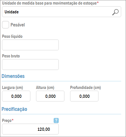 Na sequência, preencha o campo Unidade de medida base para movimentação de estoque com a opção “Unidade”. Depois existem alguns campos que você pode deixar em branco, se desejar e, por fim, informe o Preço do produto. No nosso exemplo, a cesta custará R$ 120,00.