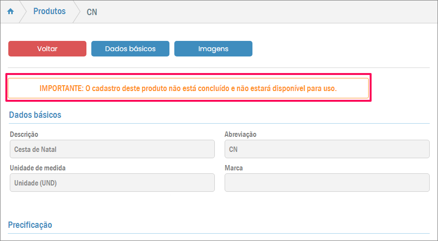 No canto superior esquerdo da tela, pressione o botão Salvar. Então, o sistema informará que o produto ainda não está disponível para uso.
