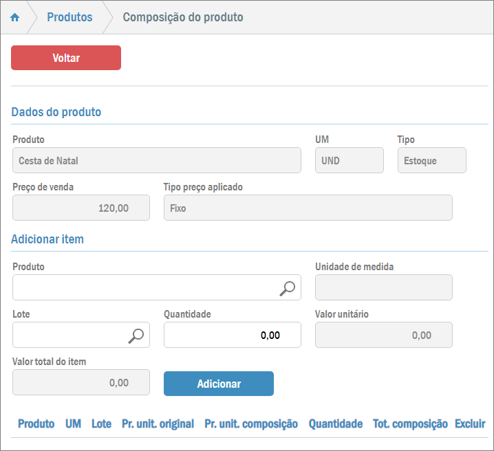 Terminando de adicionar todos os itens filhos basta você pressionar o botão Voltar. Não será necessário fazer mais nada. Agora, a “Cesta de Natal” já está pronta para ser vendida!