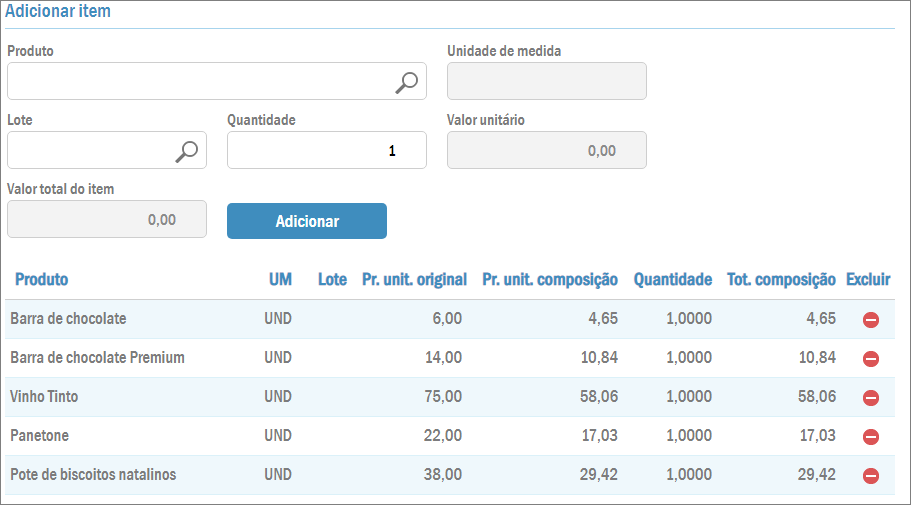 Ao terminar de preencher os campos, pressione o botão Adicionar. Assim, o respectivo item filho será listado no grid abaixo e os campos serão limpos para você poder adicionar o próximo produto. Um por um, eles serão listados no grid.
