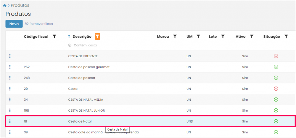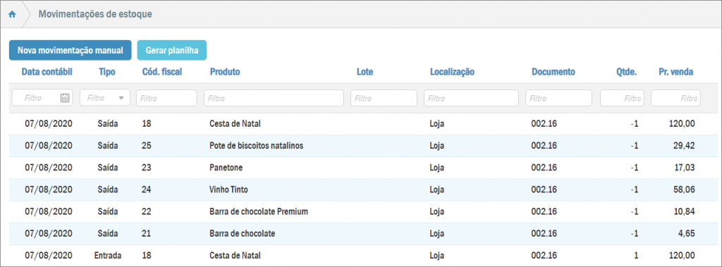Agora, a cesta de Natal em si sempre ficará com o estoque zerado, pois ela na prática não existe como um produto, ela é a junção de todos estes que de fato serão movimentados. Na verdade, em toda a venda de um produto de composição de estoque, você verá na movimentação de estoque a saída de uma cesta e a entrada de outra, sempre mantendo o estoque zerado.