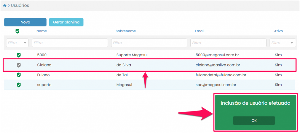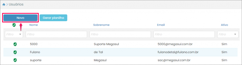 Em seguida, será aberta a tela que lista os cadastros de usuários já realizados. Para cadastrar um novo usuário, clique no botão Novo: