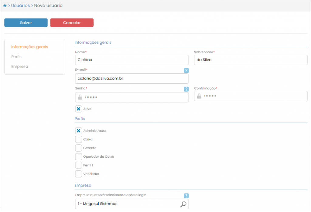 Informe o Nome e Sobrenome do usuário a ser cadastrado. Depois informe o E-mail do usuário e digite a Senha, reconfirmando-a novamente no campo ao lado. Tanto o e-mail quanto a senha informados serão utilizados como dados de login do usuário, para acesso ao sistema.