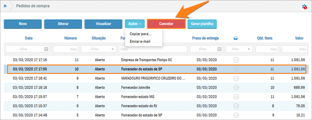 Para cancelar um pedido de compra anteriormente criado, acesse: Menu > Gestão de compras > Pedidos de compra: