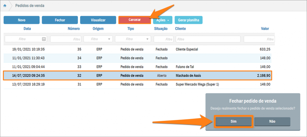 Será aberta a tela com todos os pedidos de venda já criados no sistema. Você pode pesquisar no campo Cliente para encontrar o pedido desejado. O sistema buscará pela razão social da empresa e também pelo nome fantasia, se você preferir. Localize o pedido desejado, e que está com sua Situação definida como “Aberto”, e selecione-o. Em seguida, clique em Cancelar; o sistema exibirá mensagem questionando se deve mesmo efetivar o cancelamento: