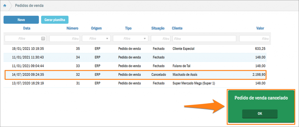 Para concluir essa etapa, clique em Sim. O cancelamento será realizado, de modo que a Situação do pedido será ajustada para “Cancelado”. O sistema retornará a mensagem de sucesso abaixo: