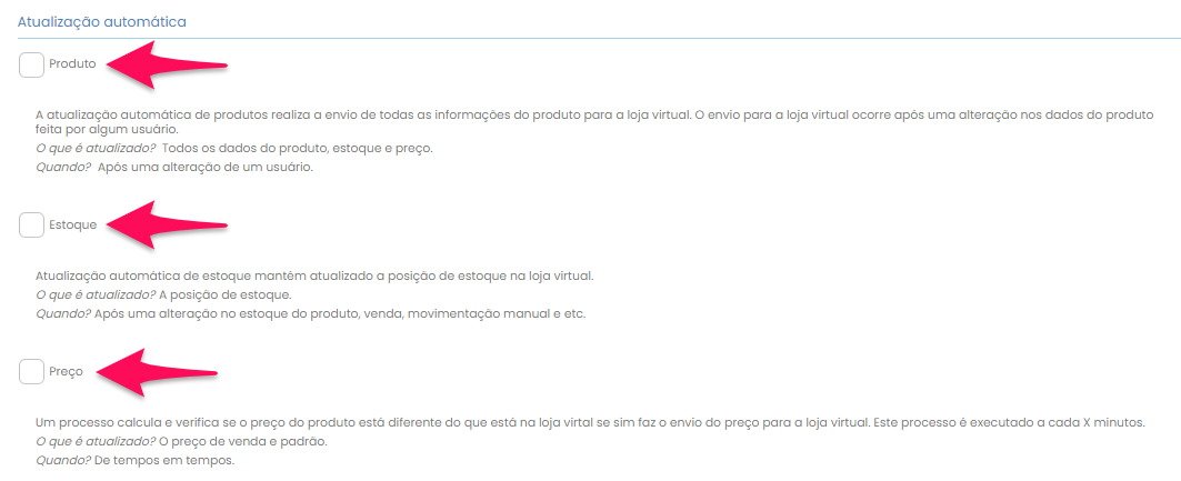 Na divisão “Atualização automática“, marque a caixa de seleção dos itens que você deseja atualizar automaticamente. A atualização ocorre enviando os dados dos itens do VarejoCloud para a loja virtual, ou seja, ao realizar a atualização os itens da loja virtual serão alterados para se igualarem aos itens do VarejoCloud.