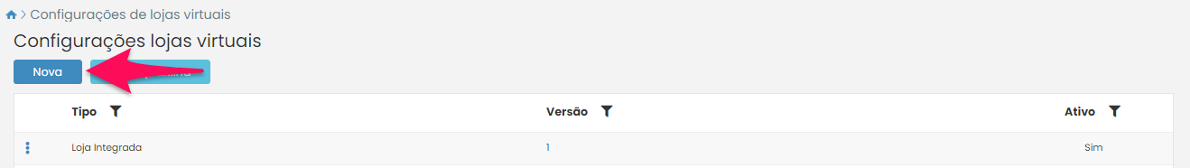 O primeiro passo para configurar uma integração é abrir o menu do VarejoCloud e acessar a página Integrações > Loja virtual > Configurações. Desta forma, você será redirecionado para a página com as configurações já cadastradas. Clique no botão Nova para criar uma nova configuração.