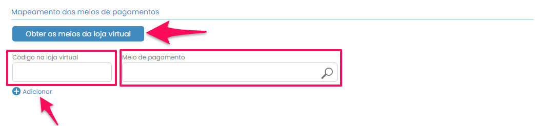 Abaixo, importe os meios de pagamento cadastrados na sua loja virtual e faça a vinculação com os meios de pagamento já cadastrados no VarejoCloud. Para isso, clique no botão Obter os meios da loja virtual e preencha os campos conforme solicitado.
