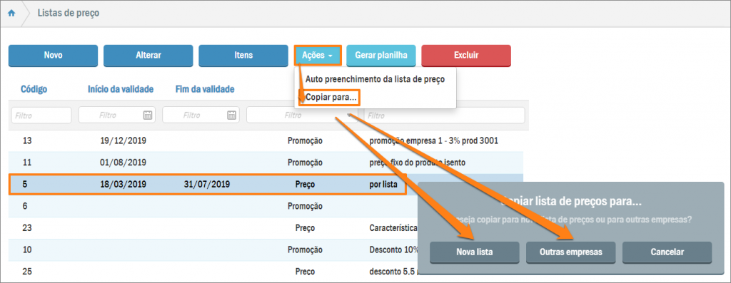 Você pode utilizar uma lista de preço ou uma promoção para vender produtos por valores diferenciados sem alterar os preços padrões já cadastrados no sistema. Quando é dada entrada em uma lista, ela é automaticamente vinculada à empresa que estava logada no momento do cadastro. A funcionalidade de copiar as listas e promoções serve justamente para facilitar a implantação destes preços para as demais empresas.