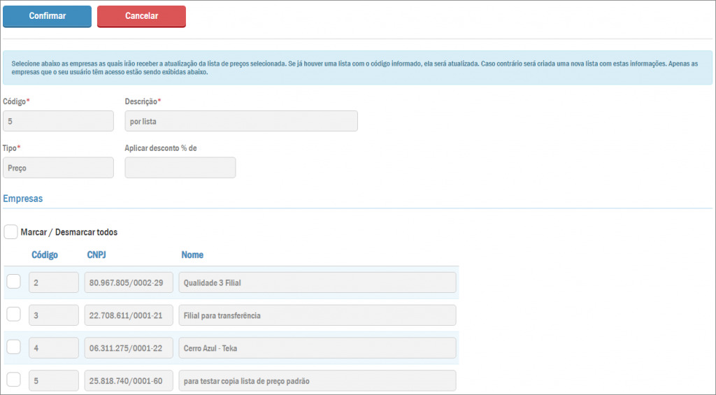 Agora, se você optar por Outras empresas, será aberta a seguinte tela para você cadastrar aquela lista ou promoção para outras empresas: