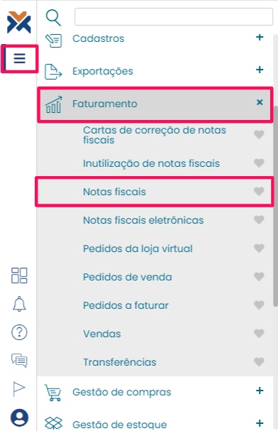 Abra o menu, vá até a guia Faturamento > Notas fiscais e clique no botão Nova para emitir uma nova nota fiscal.