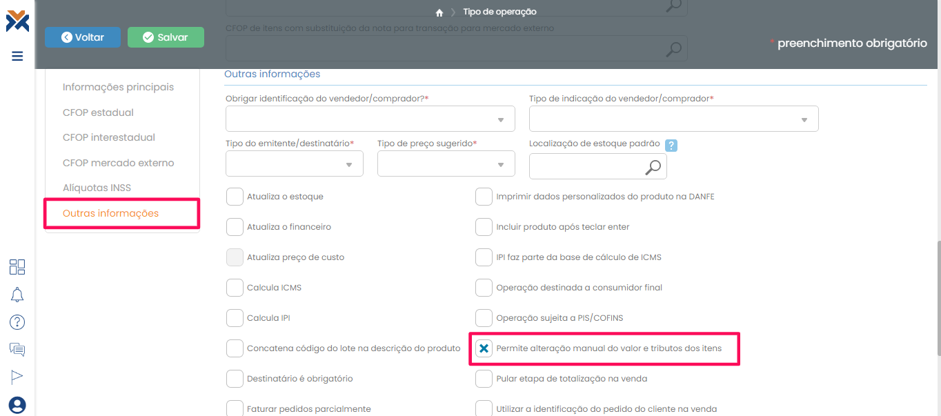 Já na página Tipo de operações, clique no botão Novo para criar um novo tipo de operação. Preencha o formulário com os dados e configurações solicitados e, na aba Outras informações, selecione a opção “Permite alteração manual do valor e tributo dos itens“.