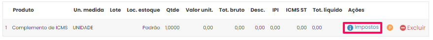 Zere o valor unitário do produto e clique no botão Adicionar. Uma grid com o item adicionado irá aparecer abaixo, clique no botão Impostos.