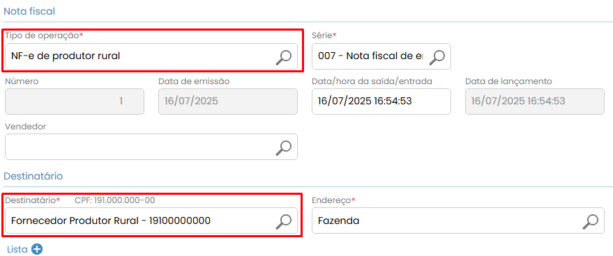 Ao iniciar a digitação da nota fiscal, quando selecionar o tipo de operação para Produtor rural, será possível identificar somente os fornecedores marcados também como Produtor rural.