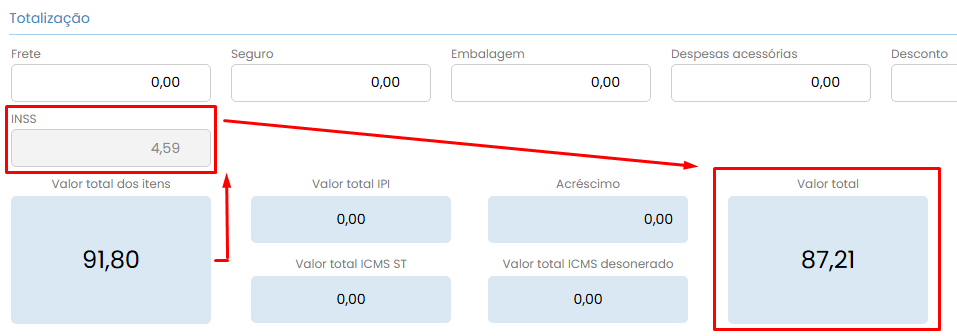 Ao final da nota, será indicado o valor total de INSS, calculados sobre o valor total dos itens aplicando o percentual cadastrado no tipo de operação.