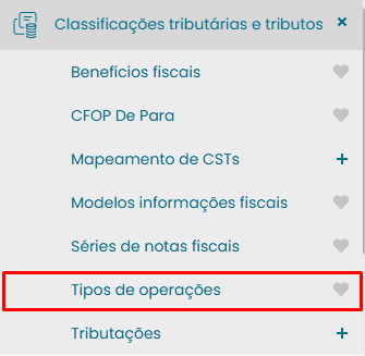 Acesse, no menu, Classificações tributárias e tributos Tipos de operações.