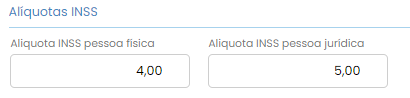 Ao selecionar este tipo, será necessário informar 2 novos parâmetros: Alíquota INSS pessoa física e Alíquota INSS pessoa jurídica.