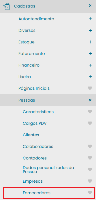 Para fazer isso, no menu, acesse: Cadastros Pessoas Fornecedores.