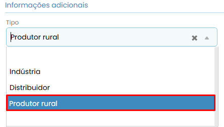 Para cadastrar um fornecedor produtor rural, é necessário selecionar o tipo: Produtor Rural.
