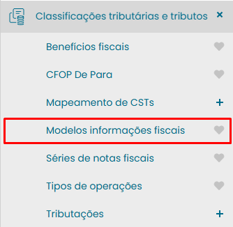 Para cadastrar um novo modelo é necessário acessar, no menu, Classificações tributárias e tributos Modelos de informações fiscais e clicar no botão Novo.