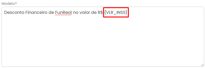 E, no campo Modelo, informe o desconto financeiro de FunRural através da tag {VLR_INSS}.