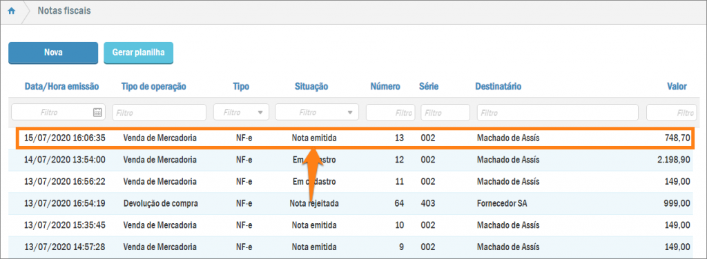 Depois que a SEFAZ autorizar a nota, você poderá avistá-la na listagem de notas fiscais com a Situação “Nota emitida”.