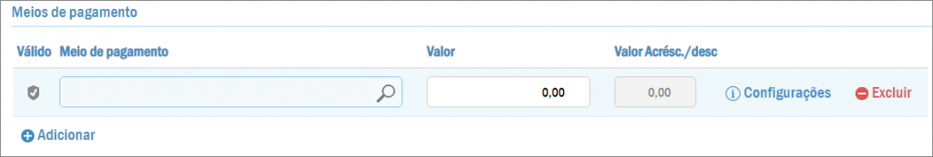 Neste campo você pode selecionar o meio desejado e ao lado o valor que será pago. Você pode selecionar um único meio para quitar a nota ou pressionar o botão Adicionar para inserir outro(s) meio(s) de pagamento.