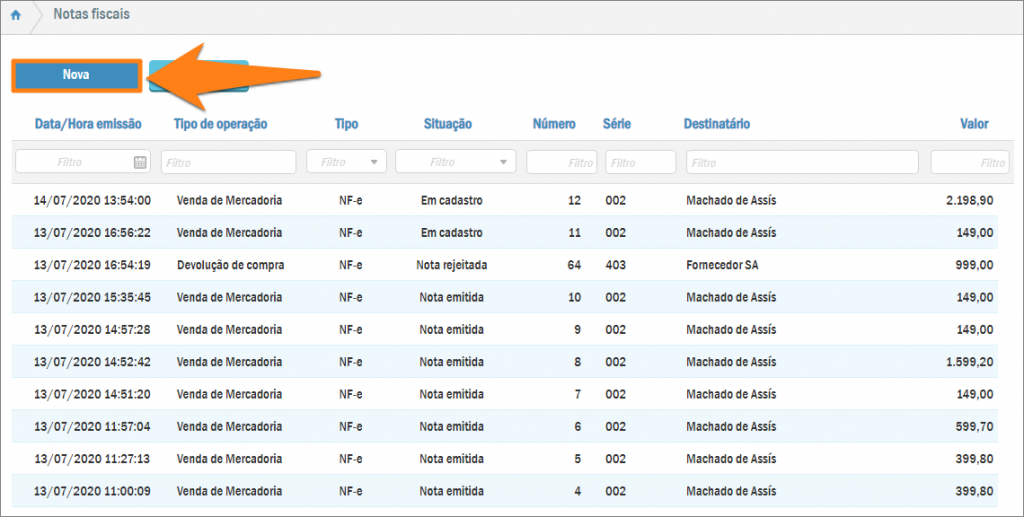 Isto o levará à listagem de notas fiscais já feitas. Para emitir outra pressione o botão Nova.