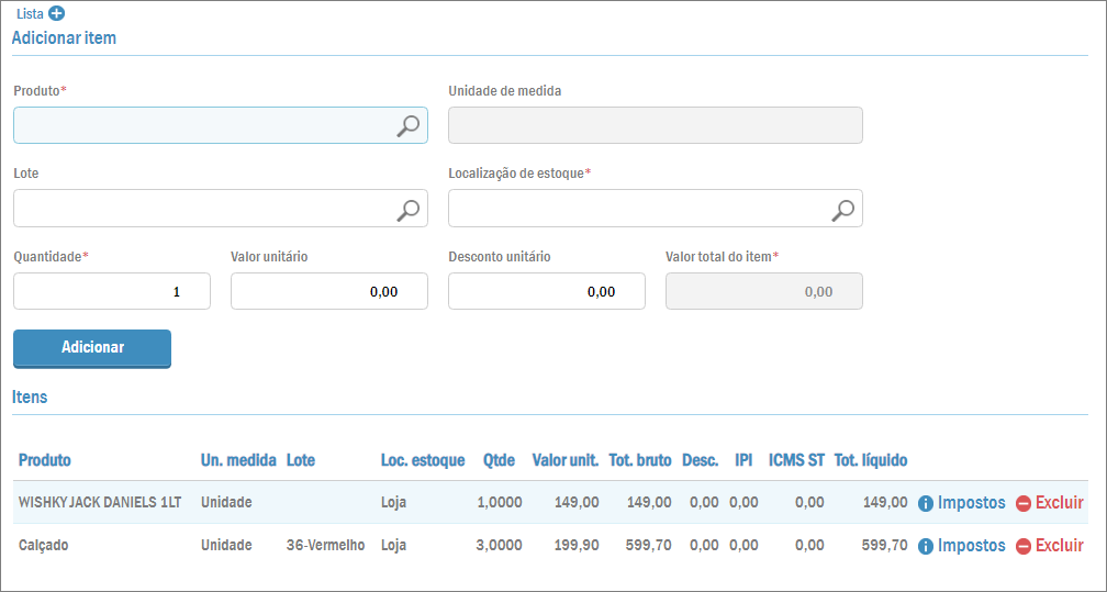 Os produtos inseridos na nota fiscal serão adicionados logo abaixo. Ao lado de cada item existem dois botões: o Excluir e o Impostos. Com eles você pode ou deletar o produto ou ver e até modificar diversas informações fiscais.
