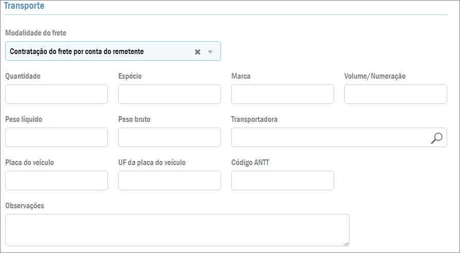 Na sequência aparece a guia Transporte, onde, se você selecionar “Sem ocorrência de transporte” no campo Modalidade do frete, nada mais será feito. Agora, caso seja selecionada outra opção neste campo, como “Contratação do frete por conta do remetente”, por exemplo, uma série de dados pode ser informada. Veja:
