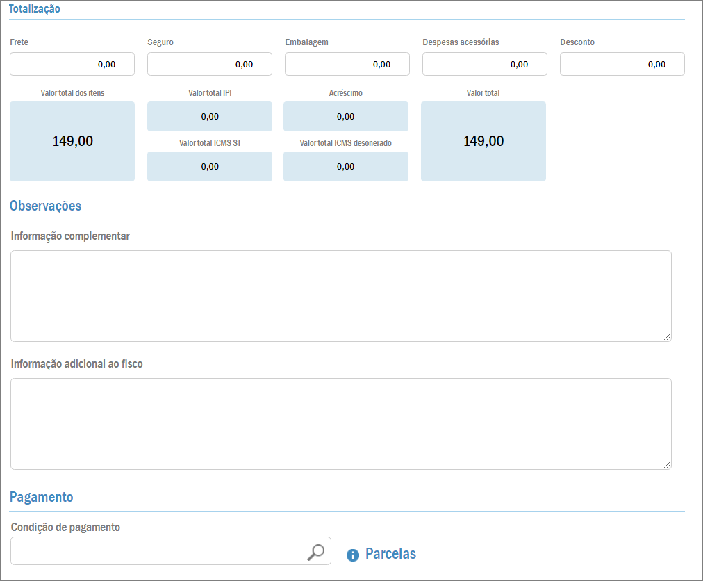 Nesta guia podem ser adicionadas informações referentes ao frete, seguro, embalagem ou até tributação dos produtos. Além disso, na guia Totalização pode-se ver a soma de diversos dados como: valor dos itens, total de IPI, acréscimo da nota, valor total e mais.