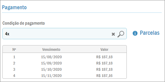 Então, na guia Pagamento, pode ser adicionada uma condição de pagamento. Exemplo: “4x”. Assim, o sistema fará o cálculo automático do valor de cada parcela e datas de vencimento: