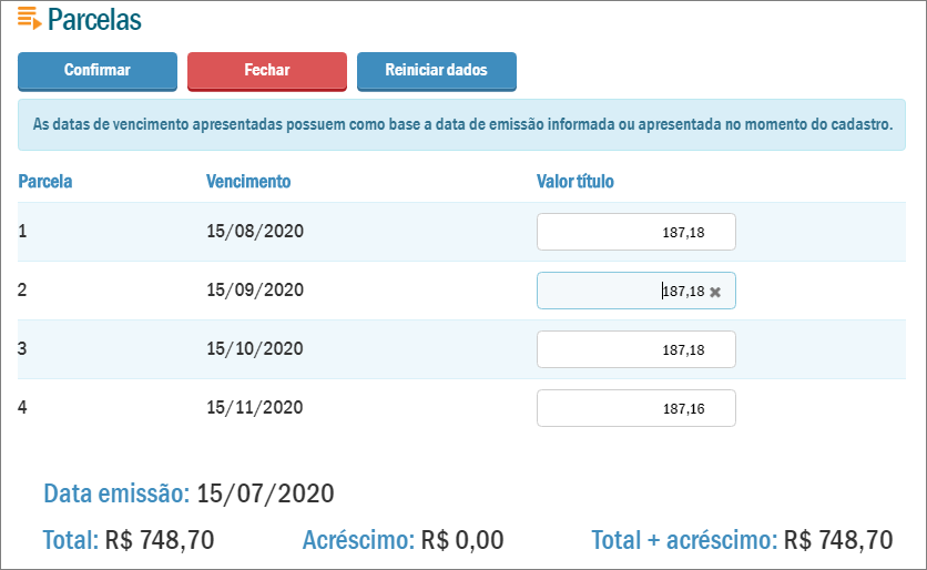 Porém, você pode fazer ajustes manuais, basta pressionar o botão Parcelas. É possível editar o valor das parcelas, todavia, é necessário que o valor da soma das parcelas bata com o valor total da nota.