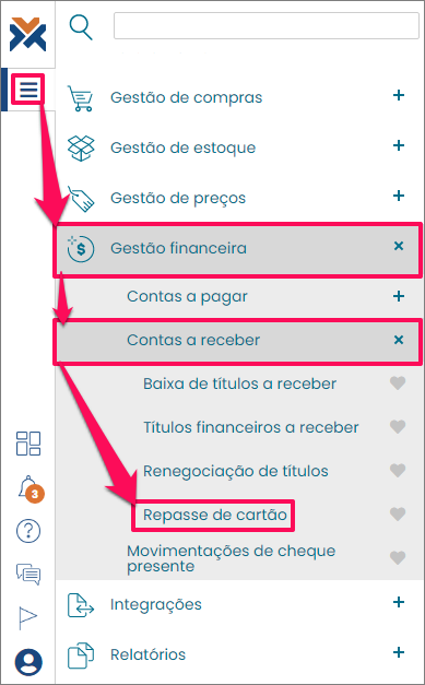 No Menu, acesse: Gestão financeira > Contas a receber > Repasse de cartão: