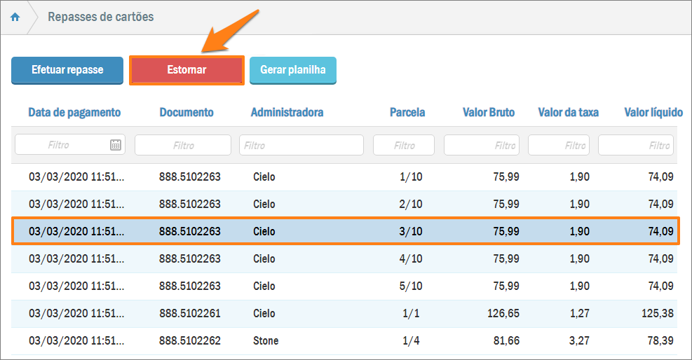 Assim, você chegará à listagem das parcelas de cartão. Selecionando alguma delas será habilitado o botão Estornar: