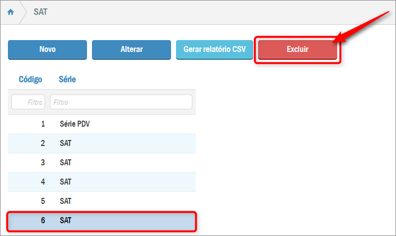 Será exibida uma listagem contendo todos os equipamentos já cadastrados no sistema. Para excluir algum deles, clique no registro desejado e em Excluir na sequência: