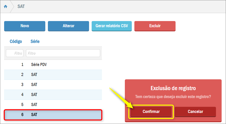 O sistema exibirá a mensagem ao lado, questionando se deve prosseguir com a exclusão do registro. Clique em Confirmar: