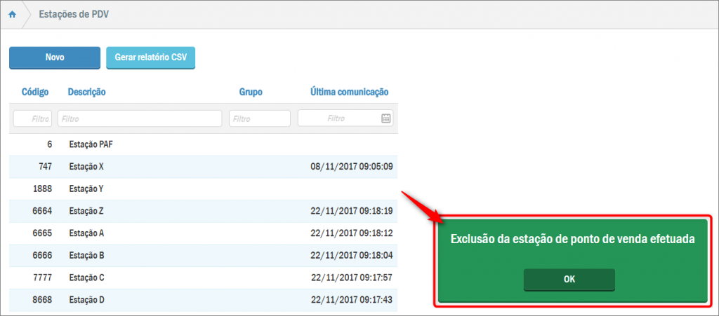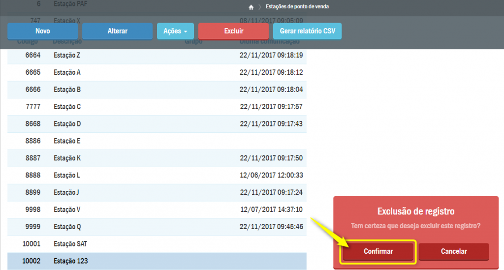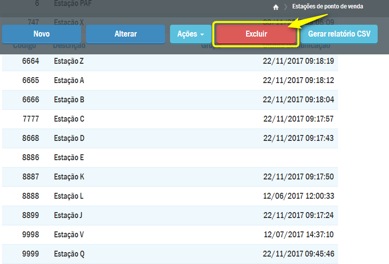 O sistema apresentará a tela contendo uma listagem de estações cadastradas. Para deletar alguma delas selecione o registro desejado e depois pressione o botão Excluir: