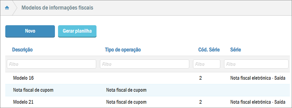 Assim você abrirá a listagem de modelos de informações fiscais: