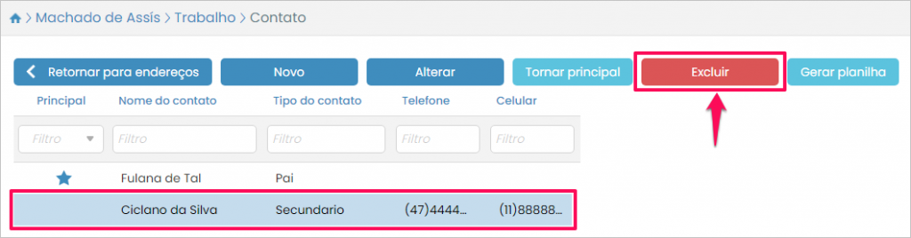 Então, selecione o contato desejado e pressione o botão Excluir.