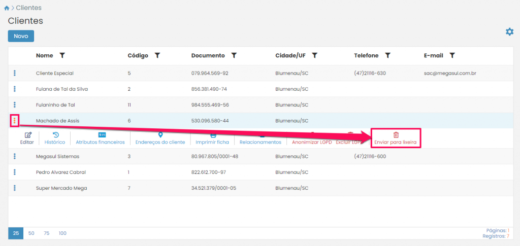 Desta forma você chegará à listagem de clientes. Para deletar o cadastro de um cliente, mas manter seus dados armazenados para caso seja necessário reativá-lo no sistema, clique nos três pontinhos ao lado do seu nome e pressione o botão Enviar para a lixeira.