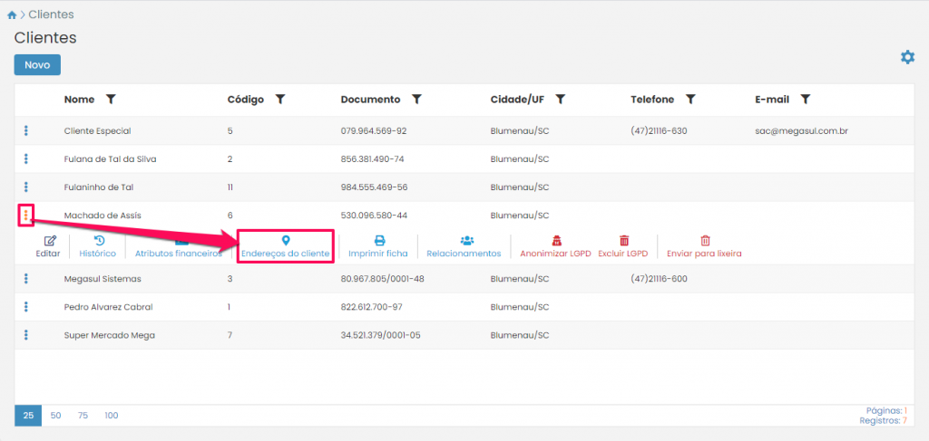 Caso você queira manter o cadastro do cliente, mas excluir um dos endereços vinculados a ele clique nos três pontinhos ao lado do cliente na listagem. Depois, pressione o botão Endereços do cliente.