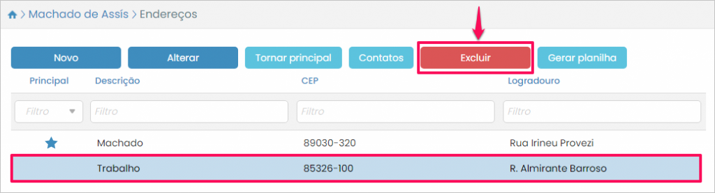 Será exibida a listagem de endereços. Basta selecionar aquele que deve ser deletado e pressionar o botão Excluir.