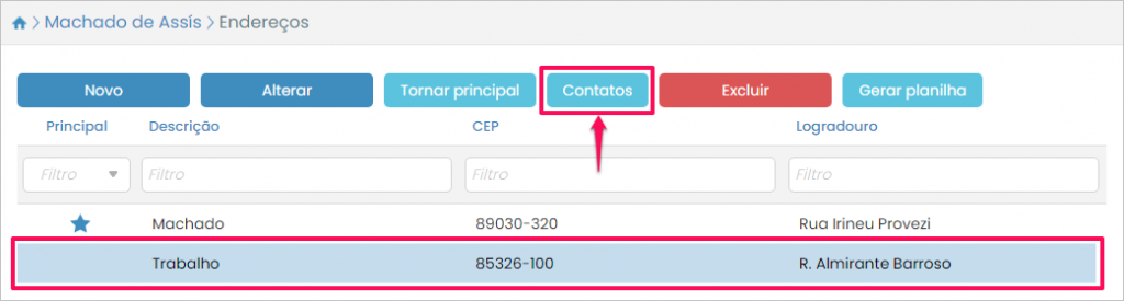 Por fim, caso você precise manter o endereço, mas deletar um contato atrelado a ele, selecione-o na listagem de endereços e pressione o botão Contatos.