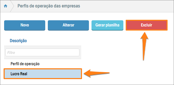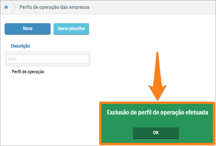 Com o perfil de operação de empresa que deve ser deletado já marcado, pressione o botão Excluir. O sistema fará o seguinte questionamento: